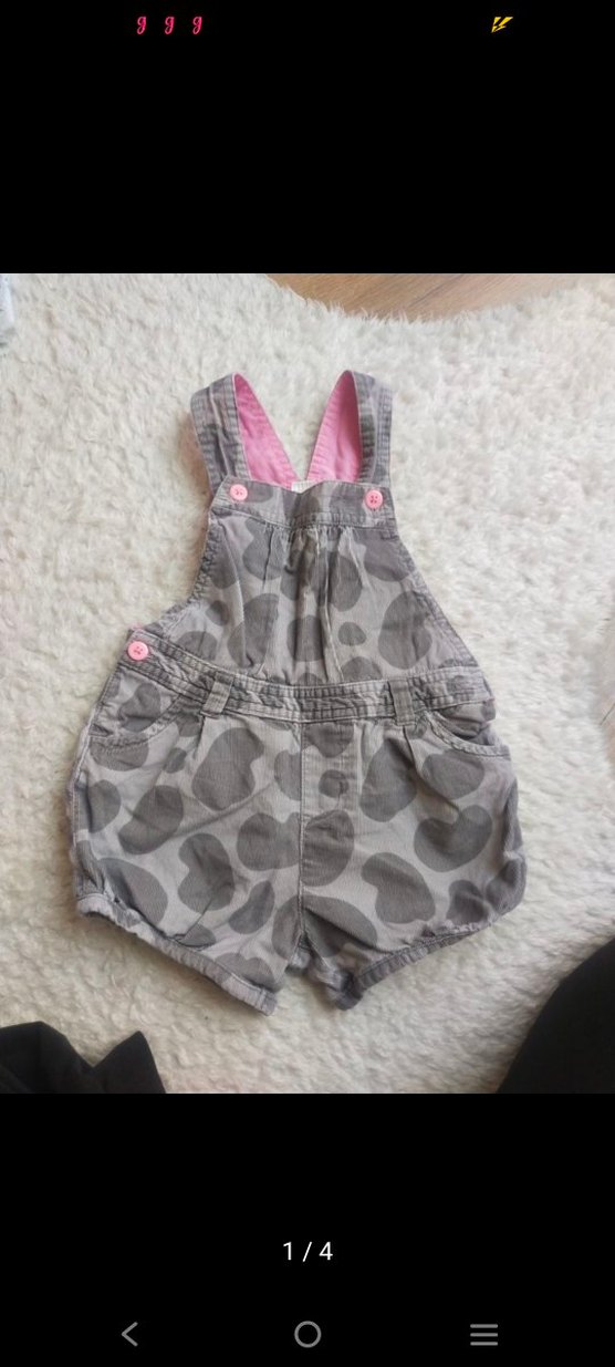 Gri, düğmeli askılı, bol kesim ve batik desenli kız çocuk tulumu. Yumuşak dokulu kumaştan, sokak tarzına uygun.