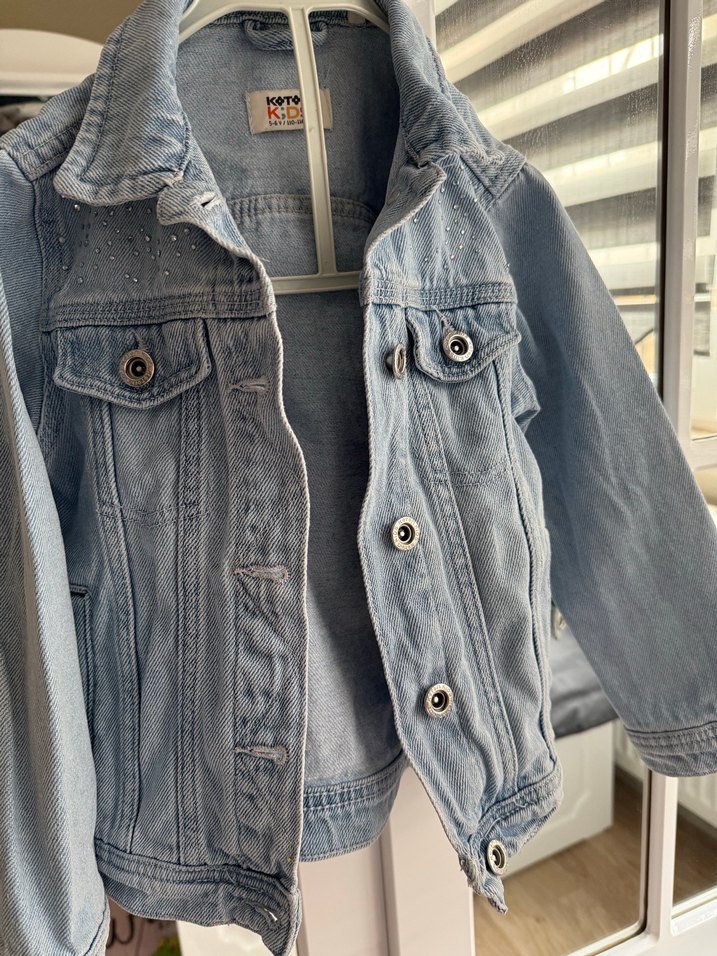 Kız çocuklar için düğmeli, mavi renkli, oturan kesimli denim ceket. Notch yaka ile sokak stiline uygun.