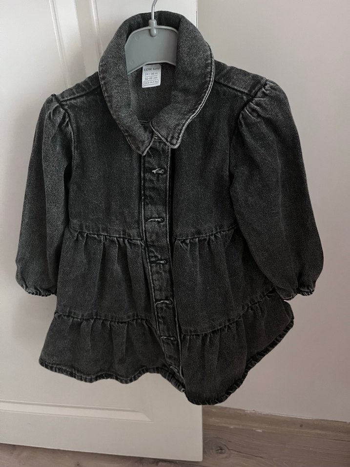 Gri denim kumaştan yapılmış, düğmeli ve notched yaka detaylı kız çocuk elbisesi. Bol kesim ve uzun kolludur, sokak stiline uygundur.
