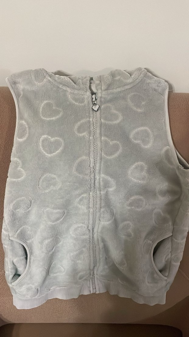 Kolsuz, düğmeli, yuvarlak yaka gri yelek. Yumuşak ve sıcak kumaştan, kalıplı ve kalp desenli, cepli, trend günlük stil için uygun.