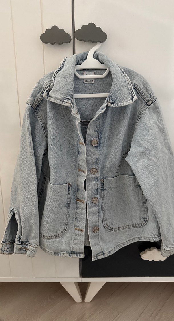 gri denim ceket, notlu yaka, düğmeli kapama ve bol kesim özelliklerine sahiptir. Uzun kollu ve iki ön ceplidir, günlük sokak stili için uygundur.