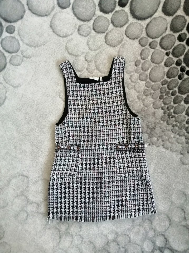 Kolsuz, kız çocuk elbisesi, gri ekose desenlidir. Önden cepli. Yumuşak sentetik kumaştan, rahat kesimlidir ve günlük sokak modasına uygundur. İki yandan içerden düğmesi var.