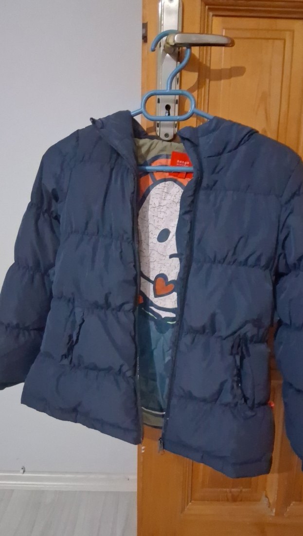 Fermuarlı, kesimli erkek çocuk montu. Yumuşak ve sıcak kumaştan, baskılı iç astarlı, mavi-gri renklerde, trend sokak tarzı için uygundur.