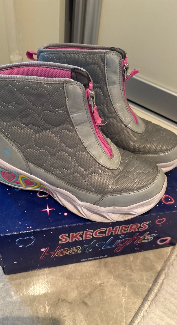 Gri renkli, fermuarlı ve nakışlı desenli kız çocuk spor ayakkabısı. Skechers Heart Lights koleksiyonundan, rahat ve şık sokak stili ayakkabı.