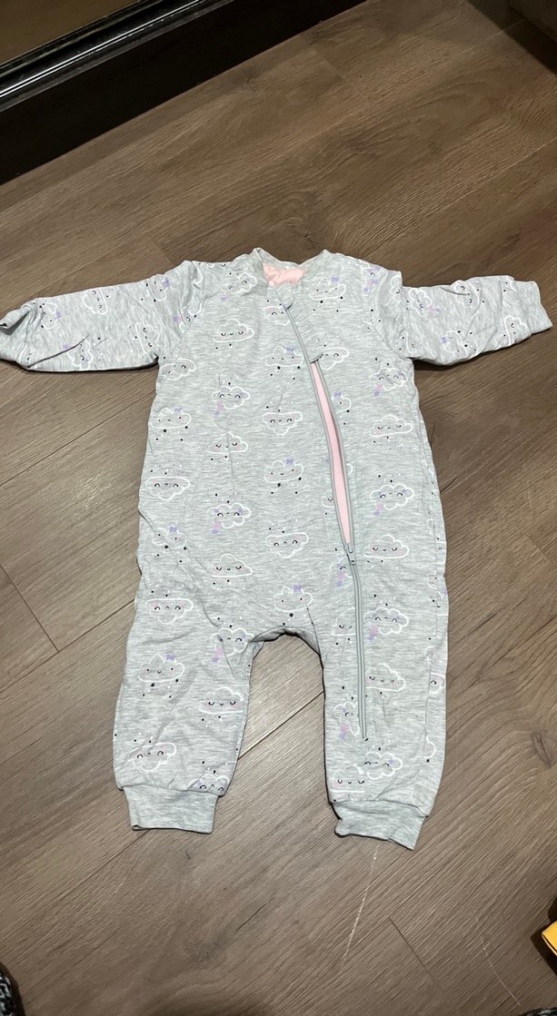 Gri renkli kız çocuk uyku tulumu, bisiklet yaka ve uzun kolludur. Fermuarlı ön kısmı ve bulut desenleri vardır. ☁️