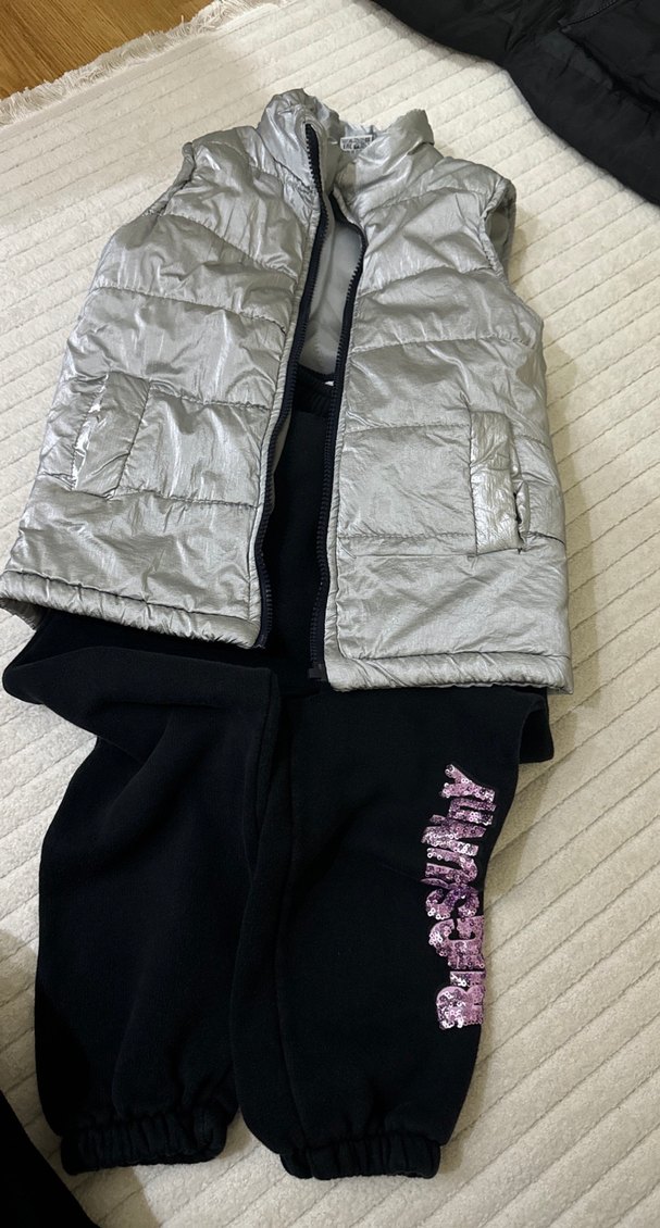 Kız çocukları için yüksek yakalı, fermuarlı cepli gri yelek ve parlak pembe logolu siyah eşofman altından oluşan rahat ve trend görünüm.