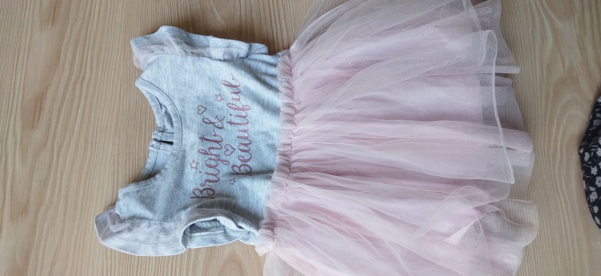 Kolsuz, fitted kesim elbise, yuvarlak yaka ve omuzlarda fırfır detaylı. Gri üst kısmı ve pembe kat kat yumuşak etek kısmı sentetik kumaştan yapılmıştır.