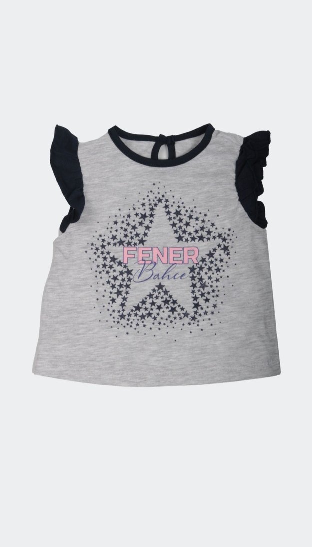 Gri renkli, kolsuz kız çocuk tişörtü, fırfırlı kollara ve 'FENER' yazılı yıldız baskısına sahiptir. Yumuşak ve sıcak kumaştan, bol kesim ve yuvarlak yakalıdır. ⭐ Fenerbahçe Baskılı Yıldız kolsuz tshirt, yüzde 50 pamuk yüzde 50 polyesterdir. Standart boydur. Bedeni 9 aylık 74 cm'dir. Gri rengindedir. yumuşak bir yapısı vardır.