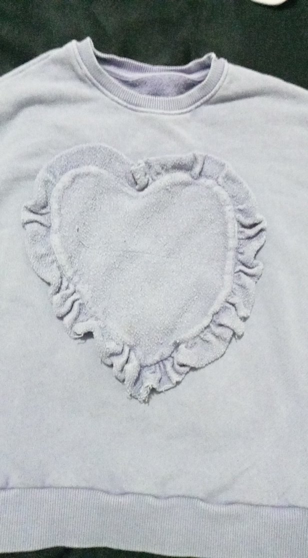 Gri renkli kız çocuk sweatshirt, bol kesim ve uzun kolludur. Önünde fırfırlı nakışlı kalp deseni bulunur.