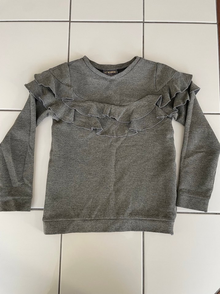 Gri renkli kız çocuk sweatshirt, uzun kollu ve yuvarlak yakalıdır. Önde fırfır detayı bulunur, bol kesim ve mevsimlik kumaştandır.
