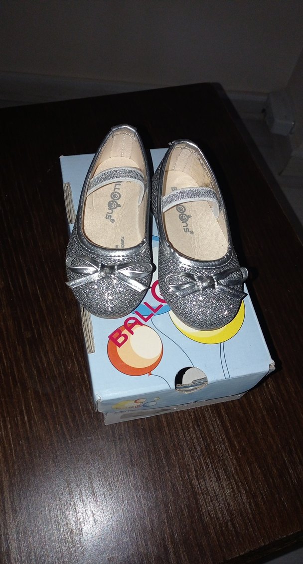 Gri renkli, baskılı simli yüzeye ve fiyonk detayına sahip kız çocuk babet ayakkabı, rahat sokak stili için kauçuk malzemeden üretilmiştir.