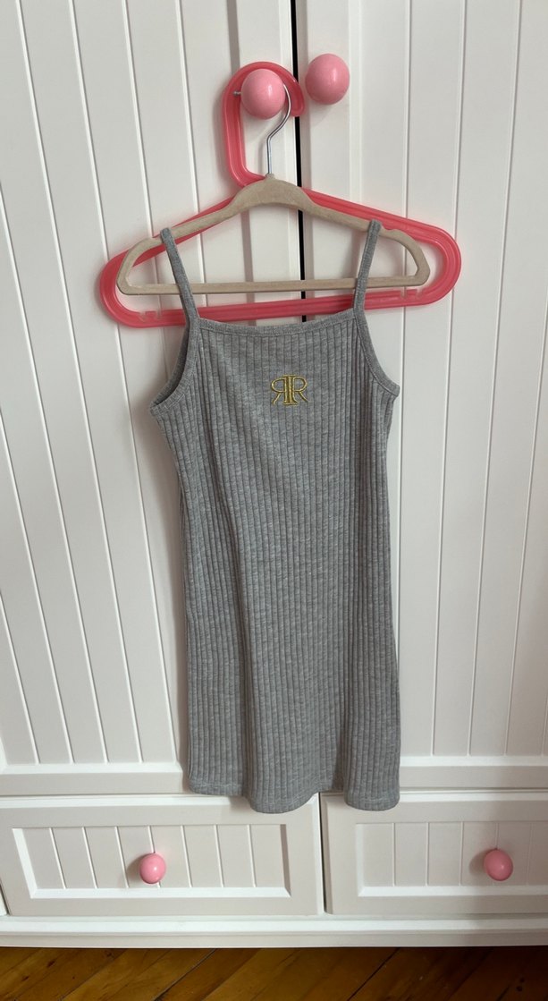 Kız çocukları için ince askılı, gri triko elbise. İnce fitli ve göğüste küçük nakış detayı bulunan rahat normcore tarzı.