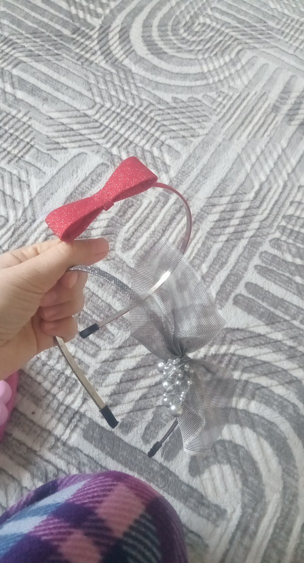 Gri inci ve fiyonk detaylı bir taç ile kırmızı simli fiyonklu bir taçtan oluşan çocuk saç aksesuarı seti.