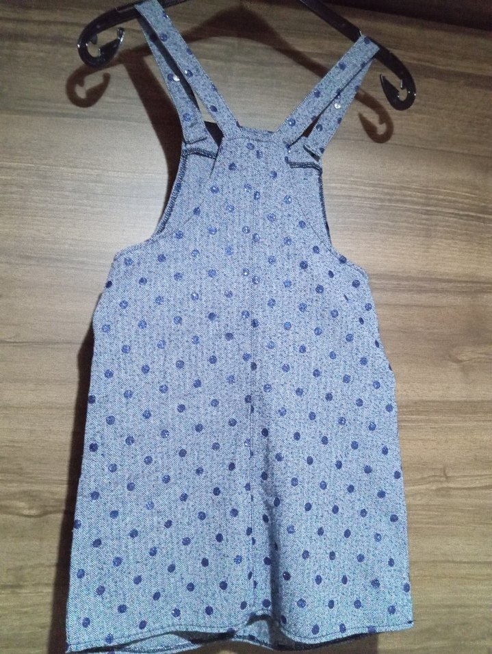 Gri-mavi renkte, bol kesim, düğmeli askılı kız çocuk jile, bohem tarzda ve hafif desenli.