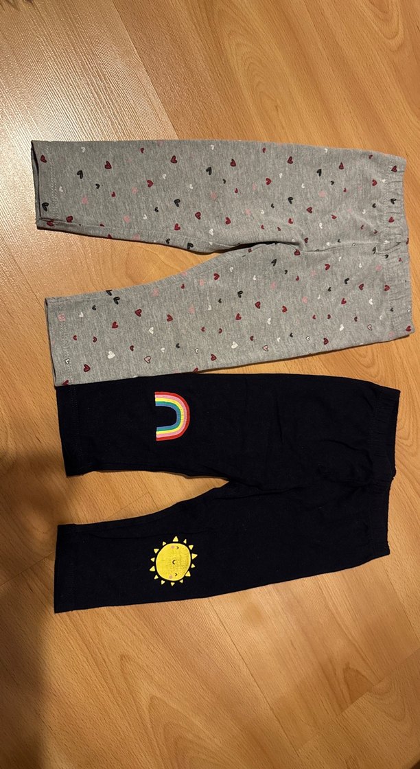 Kız çocukları için gri kalp baskılı, yumuşak ve sıcak kumaştan yapılmış taytlar. Birinde güneş, diğerinde renkli gökkuşağı baskısı bulunur.