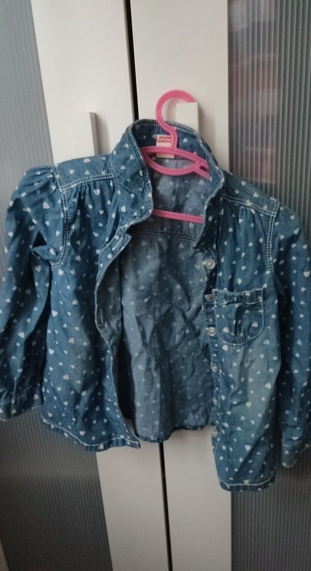 Kot kumaştan yapılmış, düğmeli ve gri kalp desenli, notched lapel yakalı bol kesim kız çocuk ceketi.