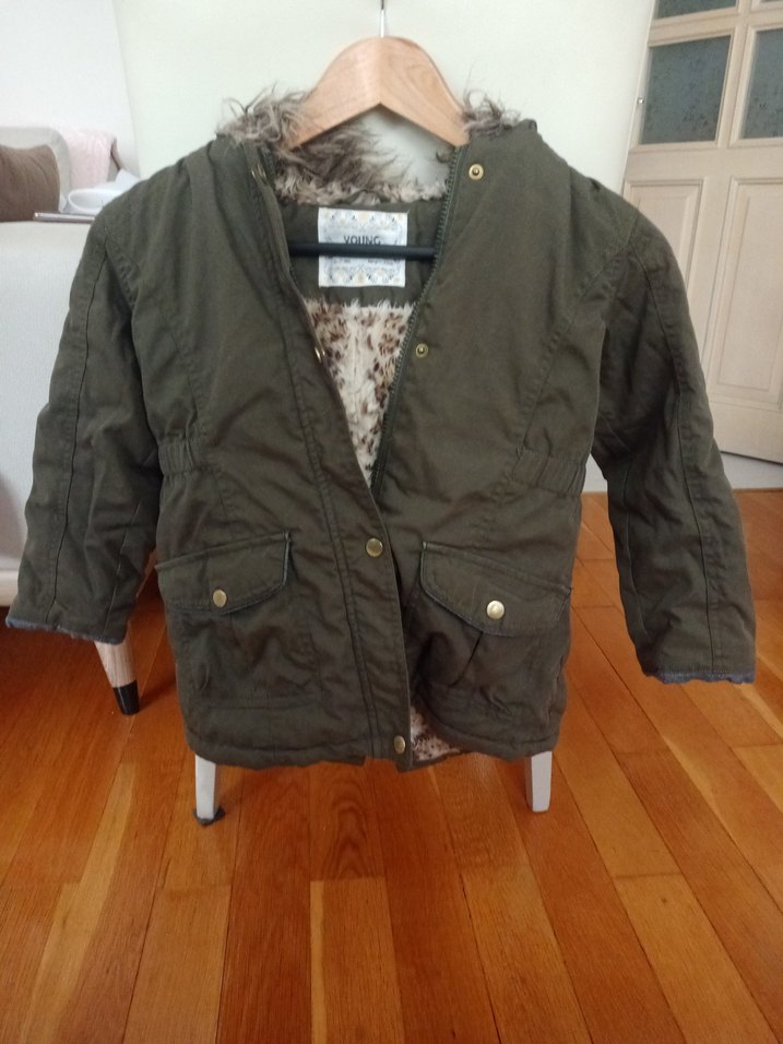 Kız çocuk için haki renkli, kürklü ve yumuşak iç astarlı bol kesim mont. sadece son çıtçıt düşmüş. ama fermuarlı kapamaya engel değil. 6-7 yaş