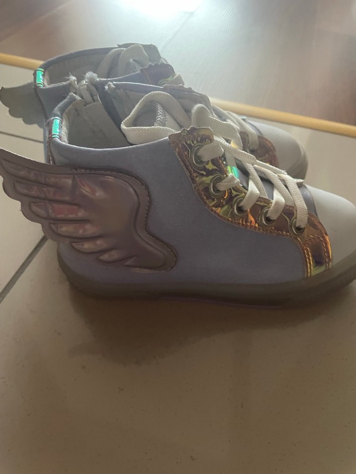 Gri baskılı kumaş ve kauçuk tabanlı kız çocuk spor ayakkabısı. Kanat detaylı ve tokalı, sokak stili için uygun.