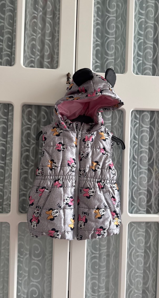 Gri kapüşonlu, kürk detaylı ve baskılı desenli, kız çocuklar için fit kesim yelek.