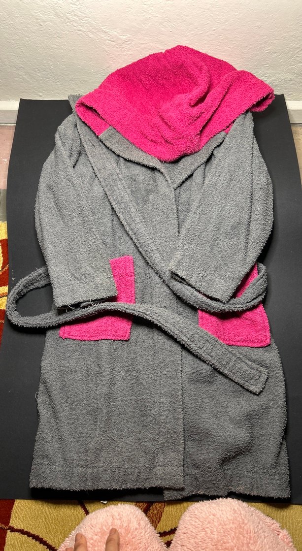 Kız çocukları için gri kapüşonlu bornoz, pembe cep detaylarıyla. Yumuşak ve sıcak kumaştan, kemerli kapanışlıdır.