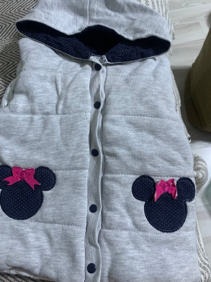 Kız çocukları için kapüşonlu, düğmeli ve fitted kesim gri yelek. Pembe fiyonk detaylı işleme Minnie Mouse desenleri bulunur, yumuşak ve sıcak kumaştan üretilmiştir.
