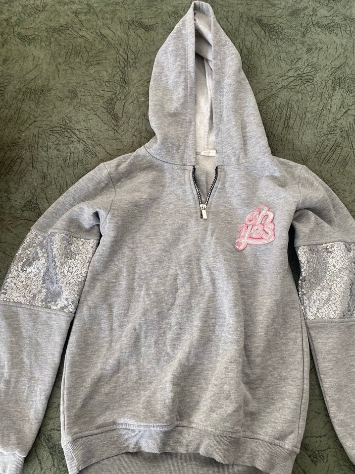 Yumuşak kumaştan, kapüşonlu ve fermuarlı kız çocuk gri sweatshirt. Kollarda işlemeli detaylarla şık ve rahat bir sokak stili sunar.