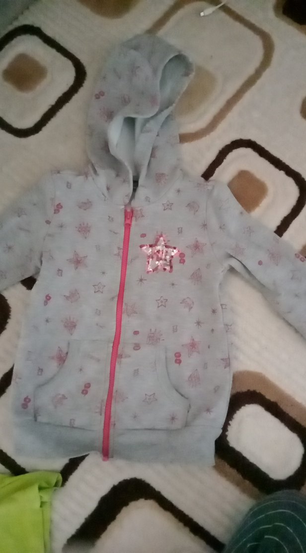 Kız çocukları için kapüşonlu, uzun kollu, fermuarlı gri sweatshirt. Yumuşak ve sıcak kumaştan, baskılı desenli, göğüste parlak yıldız detaylı.