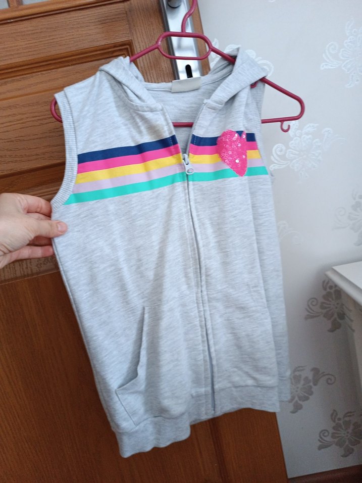 Kız çocukları için gri, kapüşonlu ve fermuarlı, ince kesim yelek. Üzerinde renkli çizgiler ve baskılı kalp deseni bulunur, yumuşak ve sıcak kumaştan üretilmiştir.