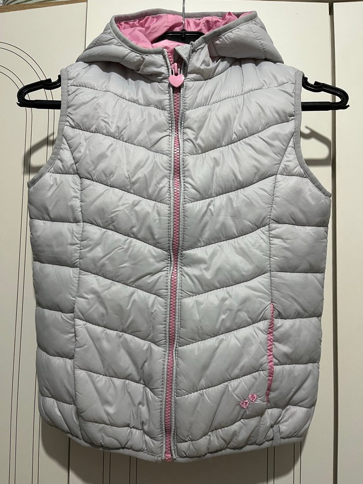 Kız çocukları için kapüşonlu, fermuarlı ve yüksek yakalı, gri renkli sentetik kumaştan yapılmış, dar kesim yelek. Trendy ve rahat bir stil sunar.