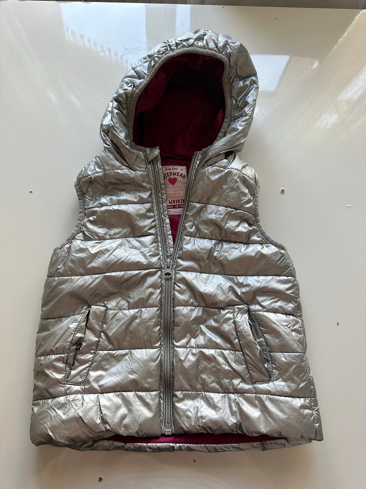 Kız çocukları için kapüşonlu, fermuarlı ve kolsuz gri yelek. Yumuşak, sıcak kumaştan üretilmiş, sokak stiline uygun ve dar kesimdir. İki fermuarlı cep bulunur.