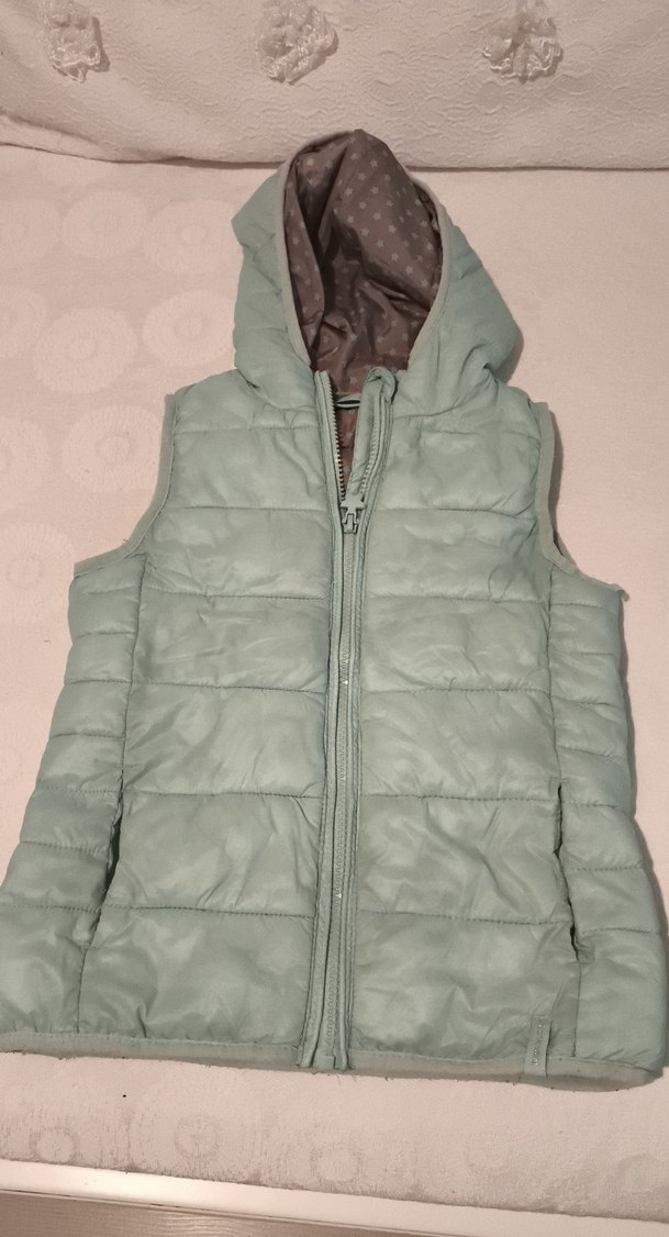 Kız çocukları için yüksek yakalı, fermuarlı, gri renkli, kolu olmayan yelek. Yumuşak ve sıcak kumaştan, sokak tarzı ve dar kesim.