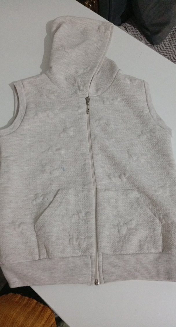 Kız çocukları için gri renkli, kapüşonlu ve fermuarlı kolsuz yelek. Yumuşak keten kumaştan, trend sokak stili için uygun ve dar kesim.