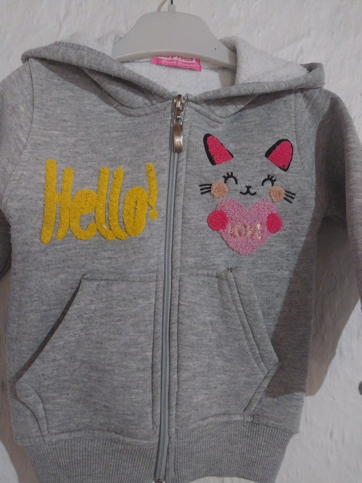 Kız çocukları için gri, kapüşonlu ve fermuarlı sweatshirt. Nakışlı desenlerle süslenmiş, yumuşak ve sıcak kumaştan üretilmiştir. resimde belirttiğim gibi cebinin orda sökük var8