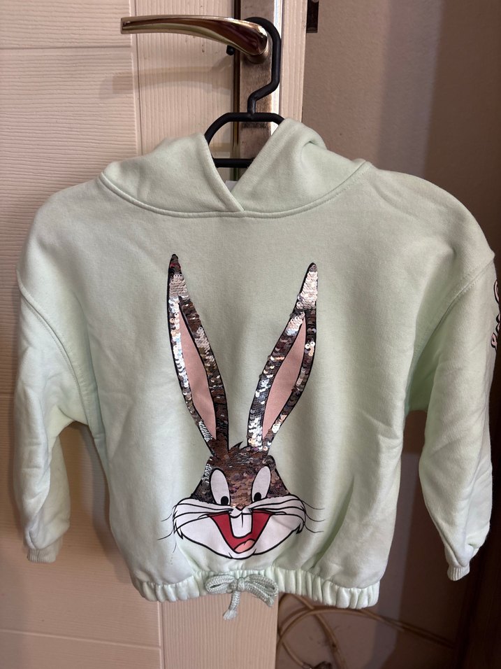 Gri pastel renkte, kapüşonlu ve uzun kollu kız çocuk sweatshirtü. Bugs Bunny baskılı ve kürk detaylı, bol kesim ve ayarlanabilir bel bağcıklı.