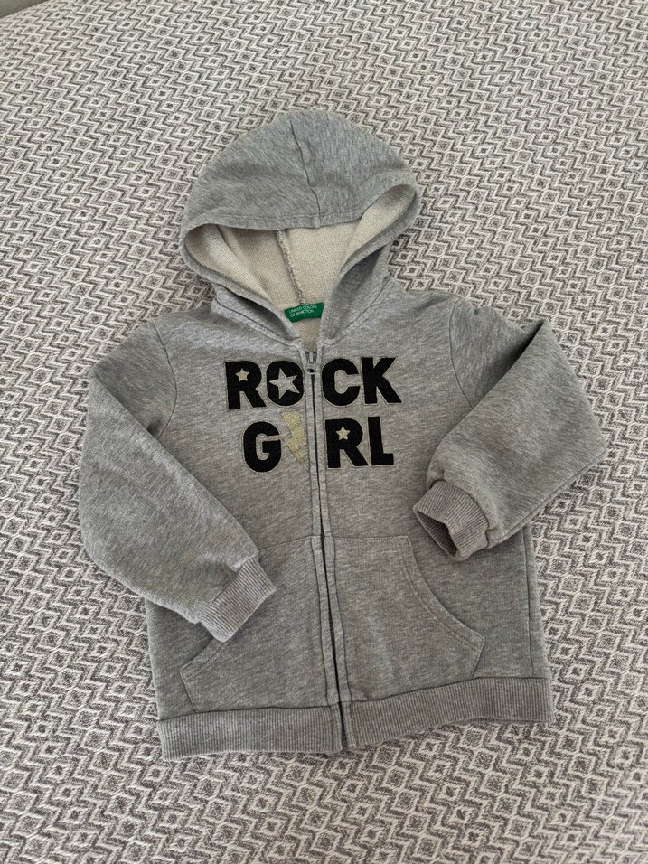 Gri renkte kapüşonlu, fermuarlı, uzun kollu kız çocuk sweatshirtü. 2-3 yaş. 98 cm. Yüzeysel hafif tüylenmesi vardır onun dışında sorunsuz. Çok az kullanıldı.