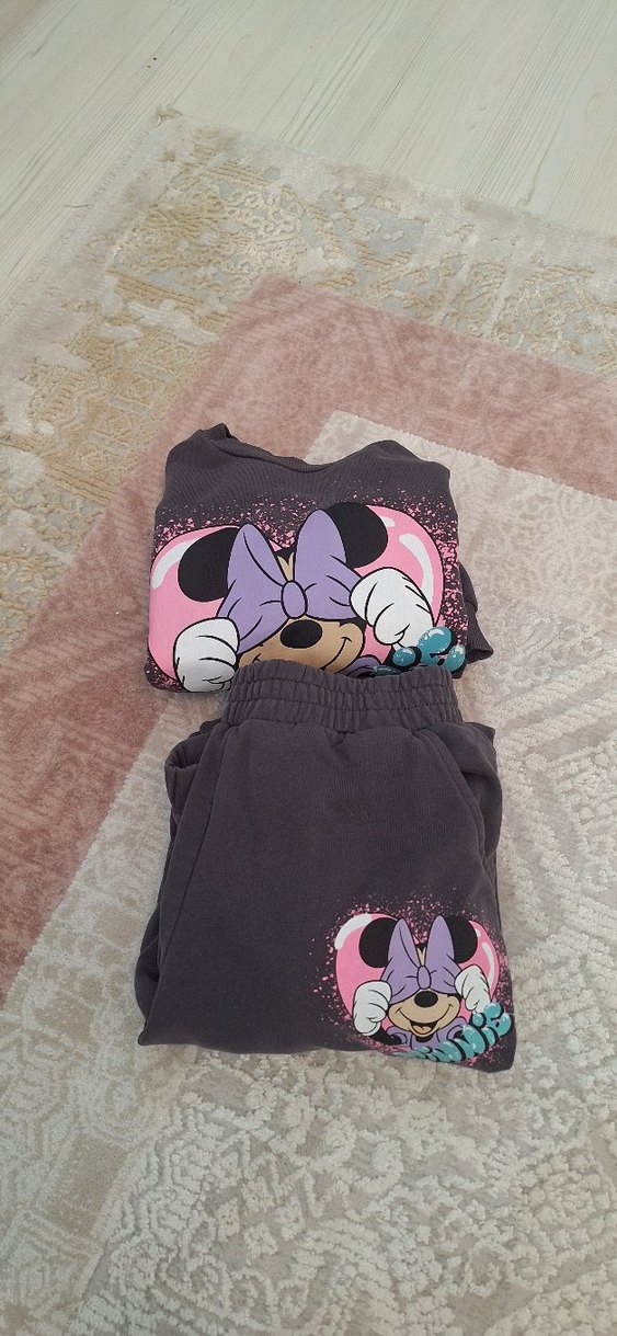 Kız çocukları için bol kesim, kapüşonlu sweatshirt ve eşofmandan oluşan gri takım. Her iki parçada da kürk detaylı Minnie Mouse baskısı bulunur, rahat ve trend sokak stili sunar.