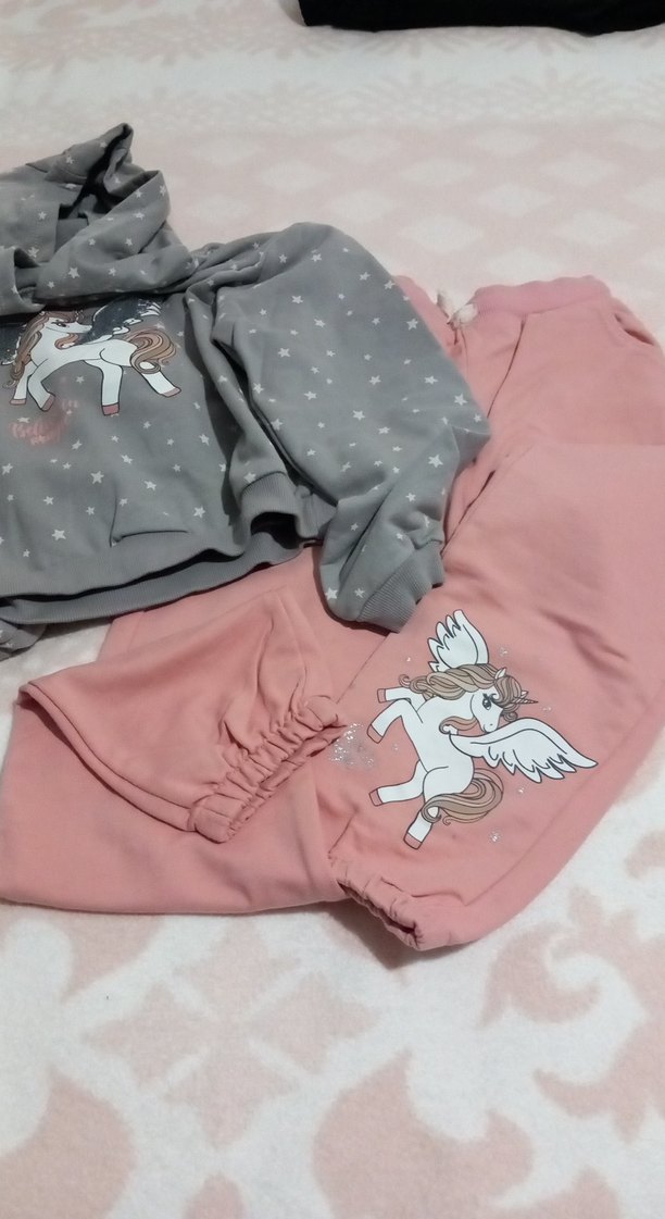 Kız çocuklar için gri kapüşonlu sweatshirt ve pembe pantolondan oluşan, unicorn baskılı, rahat kesimli, yumuşak örme kumaş eşofman takımı.