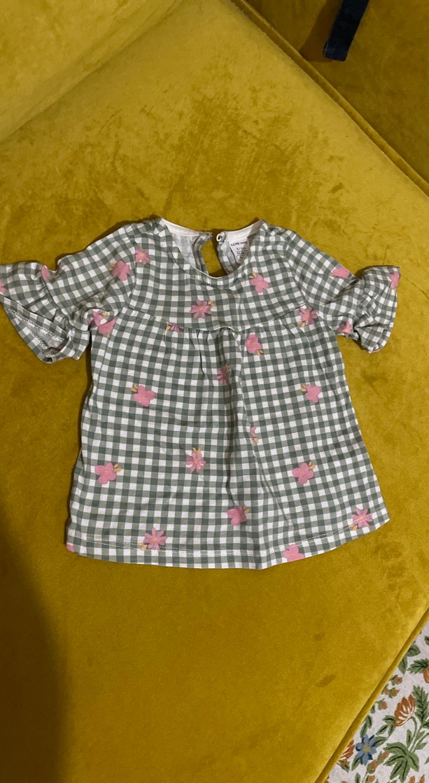 Kız çocuk elbise, kısa kollu ve fırfırlı detaylara sahip. Geniş kesimi, yuvarlak yakası ve pastel gri kareli, pembe çiçekli desenleriyle sokak stiline uygun.