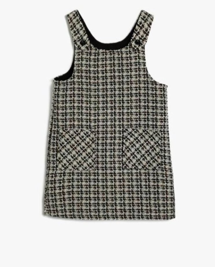 Kız çocukları için gri kareli, triko dokulu, kolsuz süveter. Yuvarlak yaka ve rahat kesime sahiptir. İki ön cep detaylıdır.