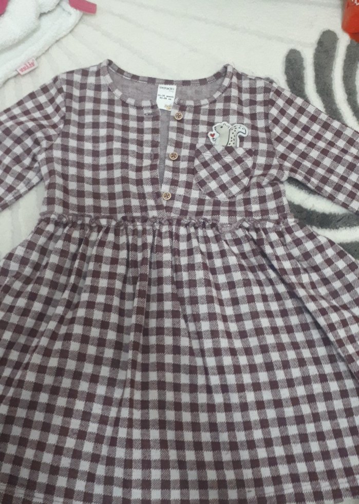 Pamuklu, gri kareli ve düğmeli, uzun kollu bol kesim kız çocuk elbisesi. Nakış detaylı bohem tarzda rahat bir modeldir.