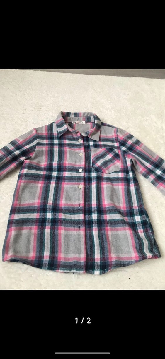 Düğmeli, uzun kollu ve yakalı kız çocuk gömleği. Gri ve pembe kareli desenli, rahat kesim ve yumuşak kumaştan, günlük kullanıma uygun.