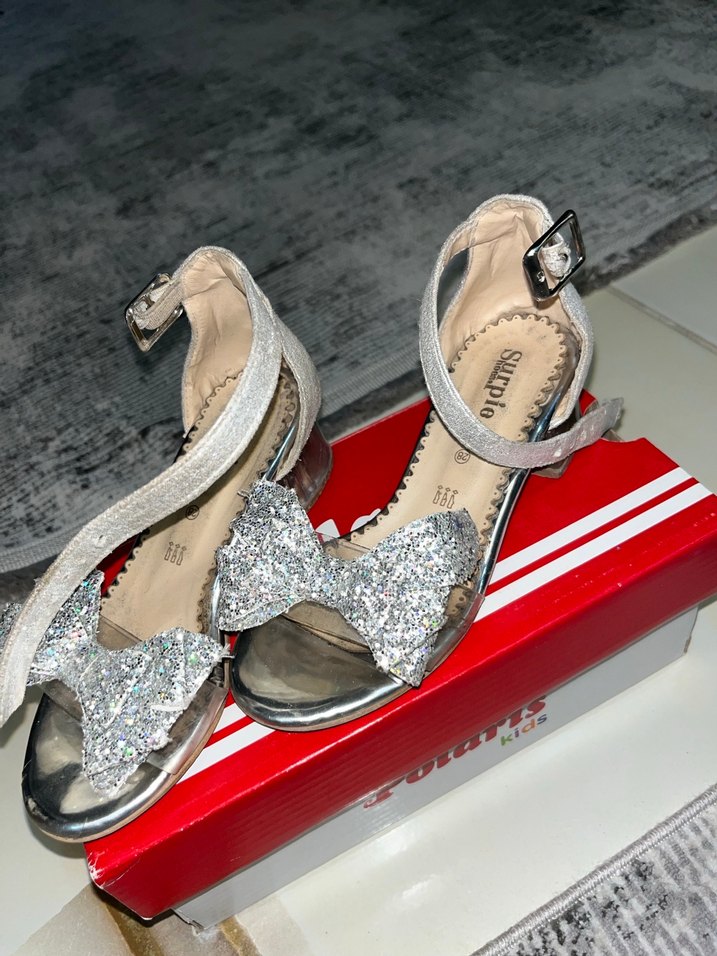 Gri renkte, kemerli ve baskılı desenli kız çocuk ayakkabısı. Önde büyük simli fiyonk ve kauçuk taban bulunur. Sokak stiline uygun.
