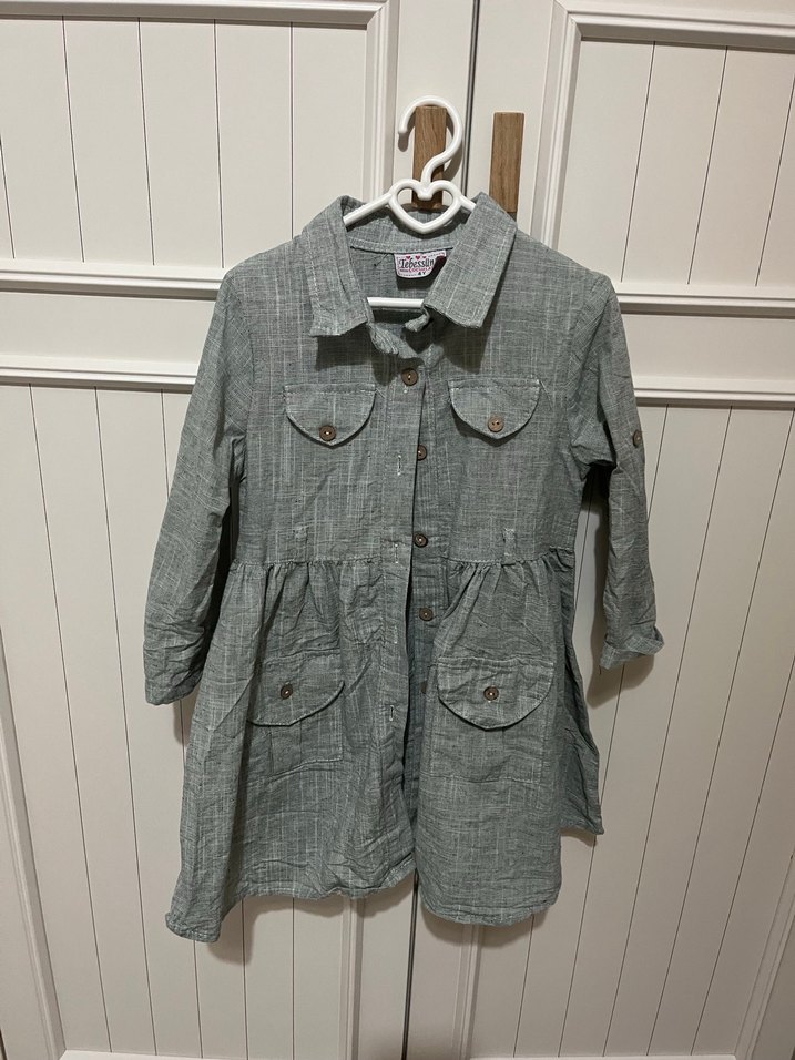 Kız çocuk keten kumaştan, düğmeli, bol kesim gri ceket. Notlu yaka ve dört cepli, sokak modasına uygun tasarım.