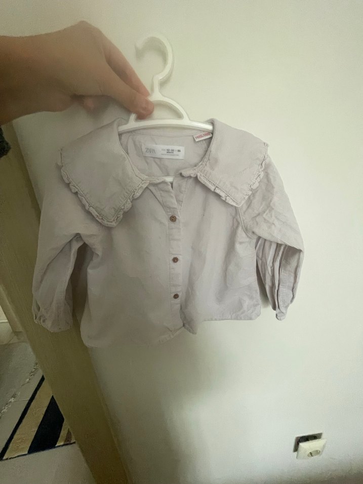 Kız çocuk için uzun kollu, yakası fırfırlı, keten kumaştan yapılmış gri düğmeli ve bol kesim gömlek.