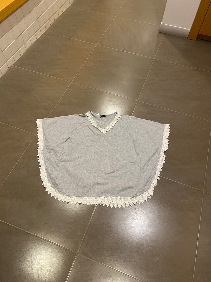 Kız çocukları için gri keten kumaştan, kısa kollu, V yakalı ve bol kesim bohem tarzda fırfırlı panço. Rahat ve şık bir görünüm sunar.