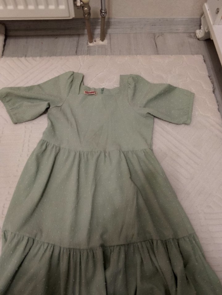 Gri keten kumaştan, kısa kollu, kayık yaka ve fırfır detaylı bol kesim kız çocuk elbisesi.