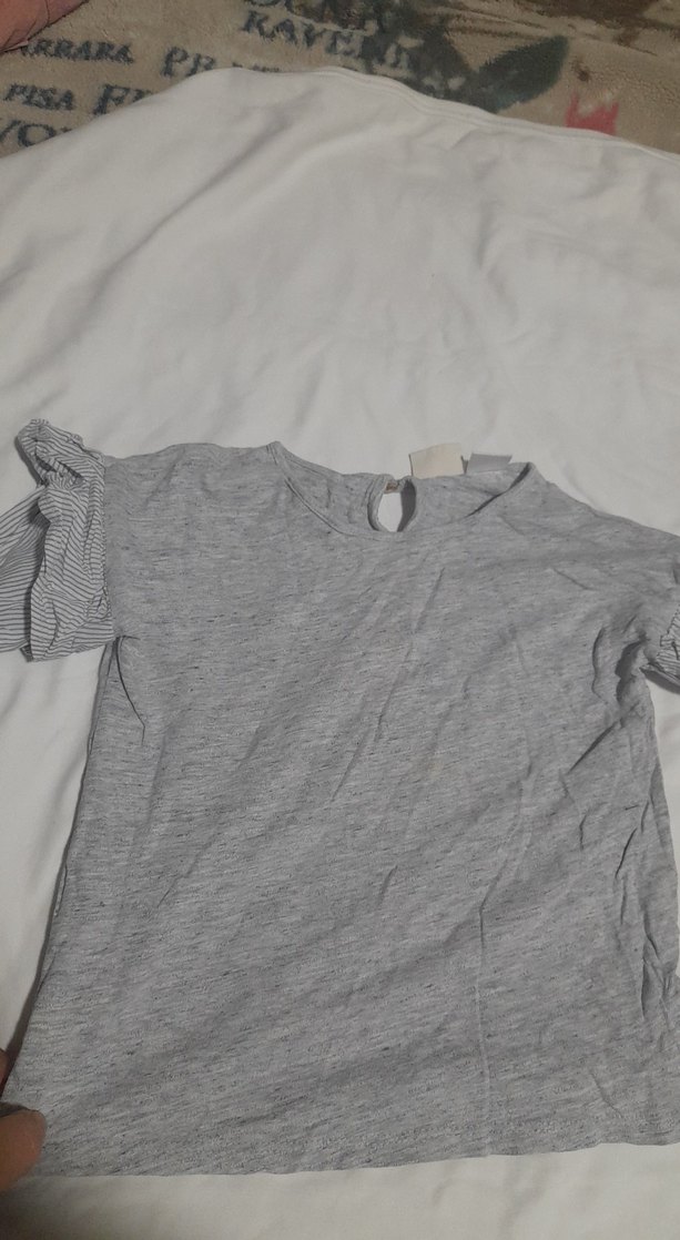 Kız çocukları için gri keten kumaştan, kısa kollu ve fırfır detaylı bol kesim tişört. Yuvarlak yakalı, desensiz ve trend günlük stile uygun.
