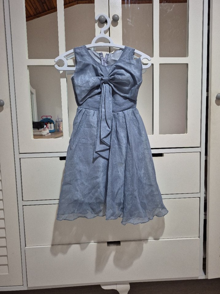 Kolsuz, gri keten kumaştan yapılmış kız çocuk elbisesi. V yaka ve önünde büyük bir fiyonk bulunur. Modern klasik tarzda, desensiz ve vücuda oturan kesim.