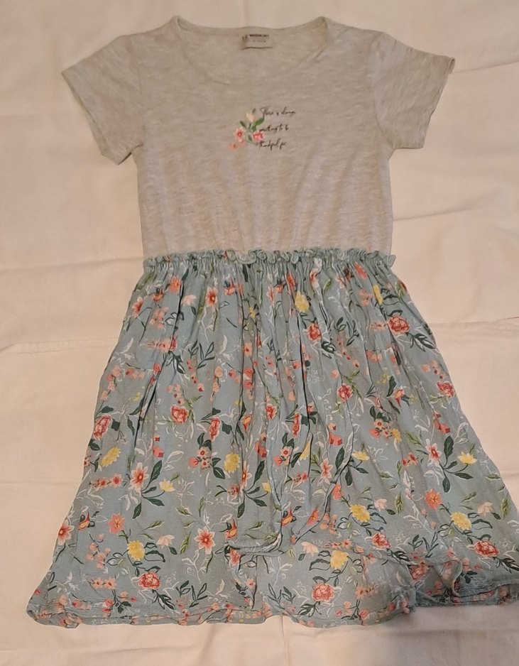 Kız çocuk gri kısa kollu, bol kesim üst kısmı ve çiçek desenli, fırfırlı etek kısmıyla elbise.