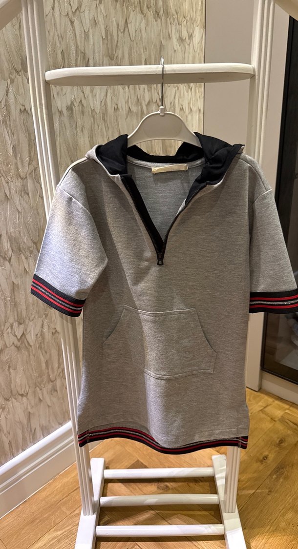 Gri renkli, kısa kollu, fermuarlı elbise. Bol kesim, bisiklet yaka ve baskılı detaylara sahiptir. Kol ve etek uçlarında çizgili desenler bulunur.